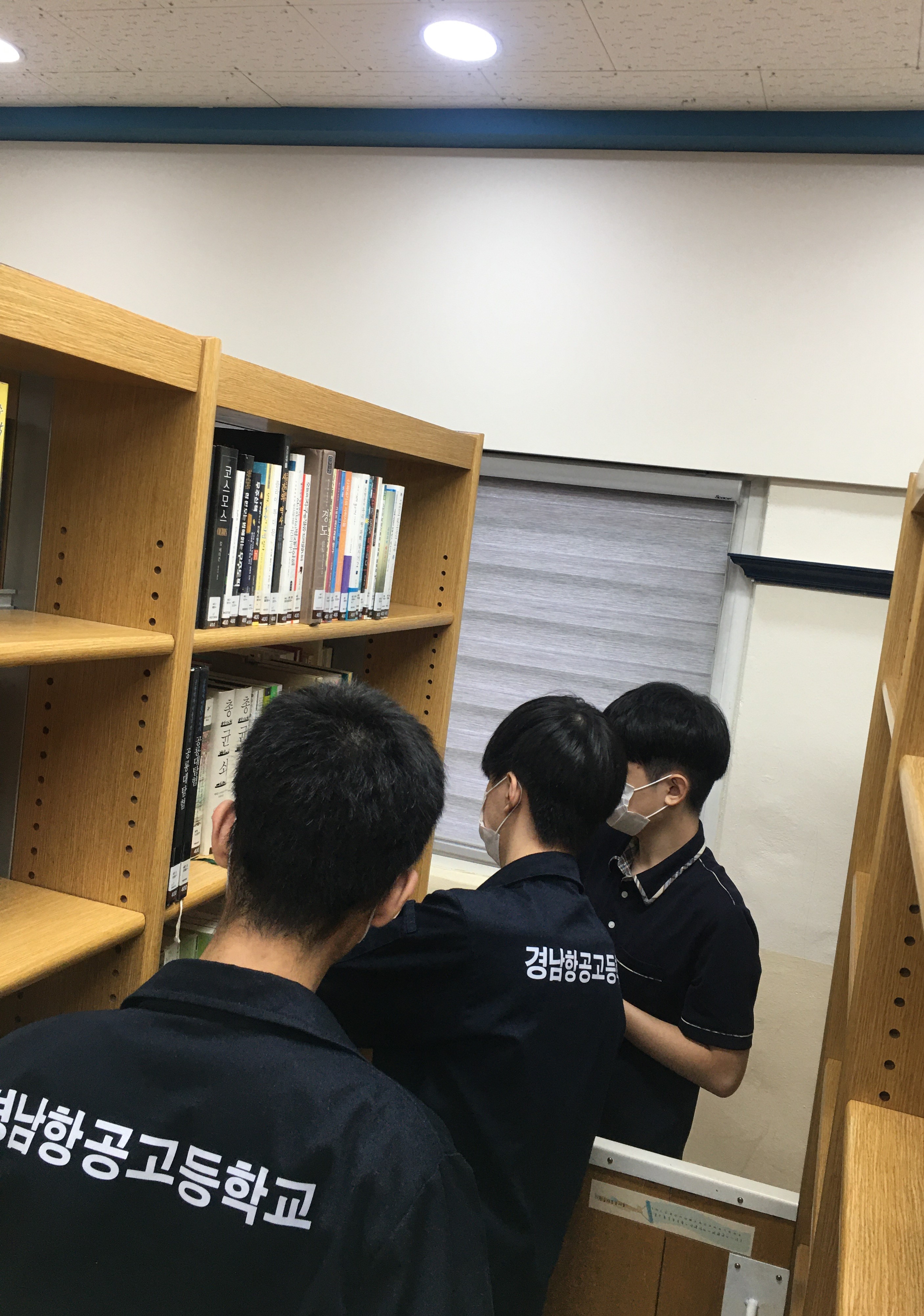 며칠째 서가정리에 구슬땀을 흘리고 있는 도서관 담당 동아리 '별마루'입니다.